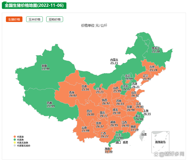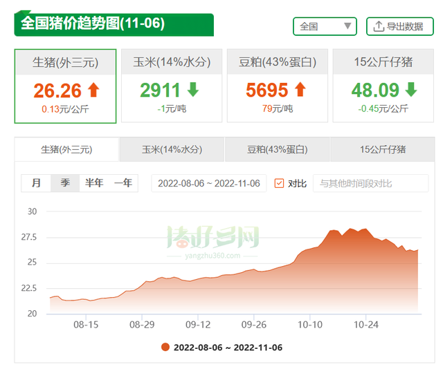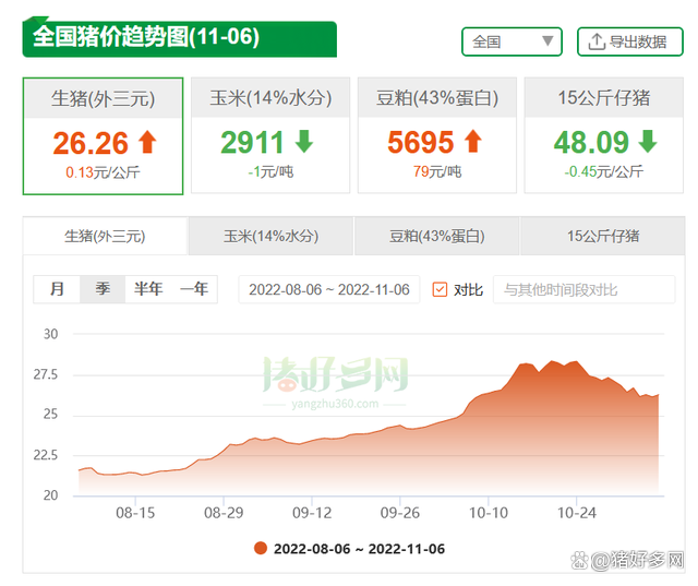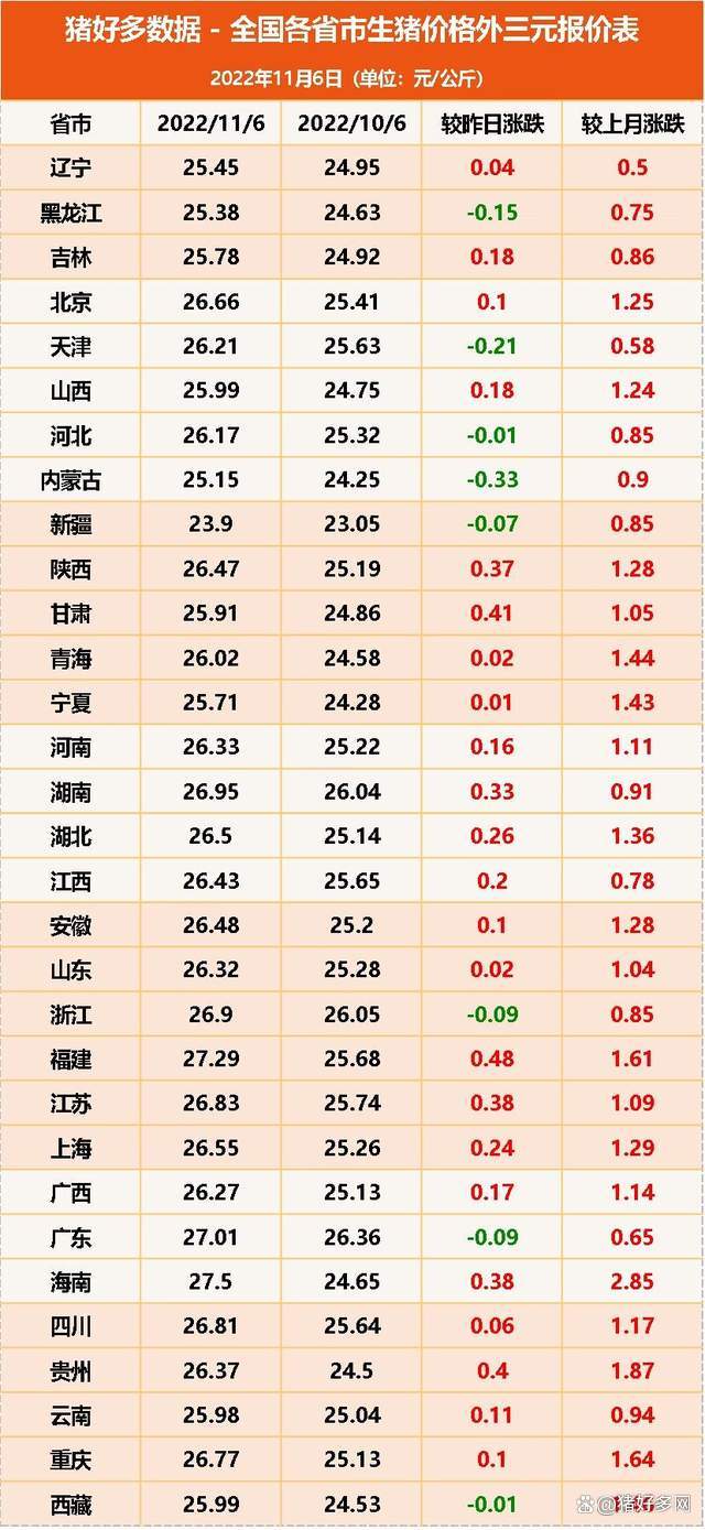 据猪好多数据监测显示,11月6日全国外三元生猪价格为26.26元/公斤,较昨日相比上涨0.13元/公斤。