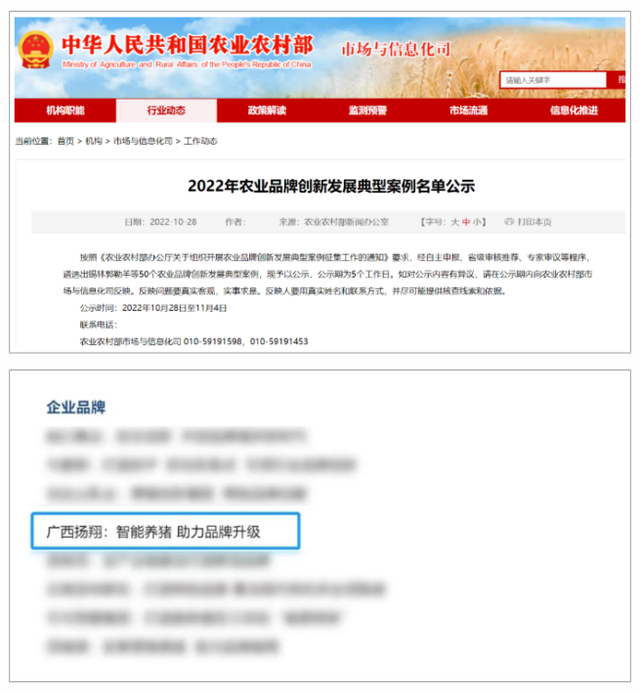 2022年中央一号文件就指出,要加快发展设施农业,推动水肥一体化、饲喂自动化、环境控制智能化等设施装备技术研发应用。在农业农村部最新公示的2022年农业品牌创新发展典型案例名单中,如广西扬翔股份有限公司的《智能养猪,助力品牌升级》就成功入选为企业品牌典型案例。