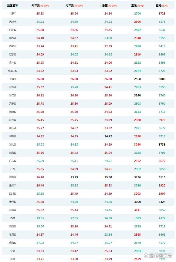 2022年11月18日(星期五)猪价系统数据监测如下:生猪品种:外三元均价为25.35元/公斤,价格较昨日上涨了0.24元/公斤;生猪品种:内三元均价为24.94元/公斤,价格较昨日上涨了0.21元/公斤;生猪品种:土杂猪均价为24.37元/公斤,价格较昨上涨了0.16元/公斤。今日玉米(饲料原料)均价2925元/吨,价格较昨日下跌了6元/吨;今日豆粕(饲料原料)均价5719元/吨,价格较昨日下跌了58元/吨。
