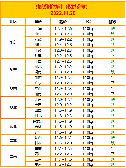 2022年11月20日,全国猪价7地平稳,0地上涨,19地下跌。猪价开启了下跌的行情,北方地区全部下跌。虽然当前的生猪产能一直困扰猪价的上涨,但二次育栏等现象还会造成市场缺猪的现象出现,只是养殖端不得不直面的问题是当下的产能过剩。虽然四季度被视为传统消费旺季,理应会带动猪价,但受“口罩”问题影响,消费始终没有起色,所以每当猪价有所上涨,出栏加速的时候,很快就转涨为跌,再加上饲料价格居高不下,猪价一直在震荡摇摆。还是那句话,不要刻意压栏,正常安排出栏。