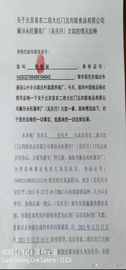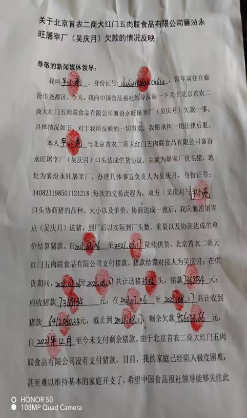 更令养猪户气愤的事,养猪户和北京二商大红门公司负责人取得联系说明原因后,北京二商大红门公司却拒不承认公司拖欠养殖户生猪款,认为那是区域经理吴庆月的个人行为与公司无关! 对此说法我们养猪户们并不认可,我们是给北京二商大红门送猪,不是给吴月庆个人送猪。并且每次送猪都有襄汾永旺屠宰厂给我们开具的过秤证明,还有吴庆月和我们的微信聊天记录以及他们公司给我们的部分转账凭证。 经过了解,襄汾县永旺屠宰厂只是负责给北京二商大红门公司进行生猪屠宰收取屠宰费,对于活猪收购和屠宰后的肉品销售都是由北京二商大红门公司进行销售。 依此情况,吴庆月不仅是北京二商大红门公司的代表也是收购活猪和结算的对接人,怎么能是个人行为呢?怎么与北京二商大红门公司无关呢! 时至今年5月份,北京二商大红门公司驻襄汾永旺屠宰厂区域经理吴庆月被公安机关羁押,导致我们这么多养猪户的千万元欠款无处讨要。拖欠我们养猪户千万元的生猪款怎么办呢?我们养殖户的维权之路将何去何从呢! 北京二商大红门公司作为国有大型肉类加工企业,不仅肩负着首都肉食品市场的供应和中央及北京市二级政府的猪肉储备任务和中央、市政府举办的各种重大活动的特供任务,还是北京市政府实施“食品安全放心工程”的重点厂家。这样一个首都北京的国企大公司,在老百姓的心中,应该是一个负责任的大厂形象。然而,该企业在实际经营中却追逐经济利益至上,疏于管理,置民生于不顾,对山西临汾众多养猪户的利益置若惘闻,推诿敷衍,不调查落实,严重侵犯了山西众多养猪户的合法权益! 目前,山西临汾周边襄汾县、蒲县、曲沃县、侯马市等多地的养猪户为了讨要生猪欠款已经走上维权之路。 在此我们不仅要问:北京二商大红门公司的区域经理吴庆月代表该公司收购的生猪调往了哪里?为什么该公司不按收购价格支付养猪户的生猪价款?该公司疏于管理致众多养猪户损失惨重并进行责任推诿的背后说明了什么?望北京二商大红门公司能够承担其应有的责任,加强经营管理,切实将农民的利益放在首位,为乡村振兴做出应有的贡献。 当事人联系方式:18234715888