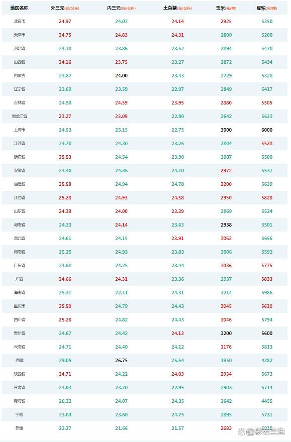 2022年11月23日(星期三)猪价系统数据监测如下:生猪品种:外三元均价为24.54元/公斤,价格较昨日下跌了0.09元/公斤;生猪品种:内三元均价为24.17元/公斤,价格较昨日下跌了0.15元/公斤;生猪品种:土杂猪均价为23.65元/公斤,价格较昨日下跌了0.25元/公斤。今日玉米(饲料原料)均价2924元/吨,价格较昨日下跌了2元/吨;今日豆粕(饲料原料)均价5589元/吨,价格较昨日下跌了34元/吨。