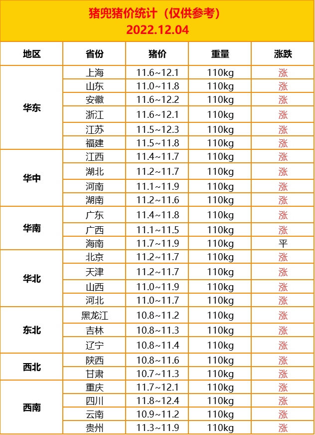 2022年12月4日,全国猪价1地平稳,25地上涨,0地下跌。猪价大面积上涨,上涨幅度也有所增加。不得不说,12月的猪价终于开启了上涨之路。从市场端来看,随着天气渐渐寒冷,需求量有所增加,尤其是腌制腊肉开始启动了,这可以说是一个不错的消息;从养殖端来看,大肥猪的比例在逐渐减小,二次育肥的比例也有所减少,更多养殖户看好后期的猪价,标猪有一定的惜售。这些方面对于猪价的上涨肯定有一定帮助,不过,对于猪价的上涨,养殖端还需要理性看待,毕竟猪肉缺口并不是很大。各地具体猪价如下:华东地区:山东上涨0.1元/斤,生猪出栏参考价12.0-12.5元/斤。华中地区:河南上涨0.2元/斤,标猪出栏参考价12.0-12.3元/斤。华南地区:广东下跌0.1元/斤,标猪出栏参考价11.8-12.3元/斤。华北地区:河北上涨0.1元/斤,标猪出栏参考价11.9-12.4元/斤。东北地区:吉林上涨0.1元/斤,生猪出栏参考价11.6-11.9元/斤。来源:猪价收集于网络、农言明日猪价等仅供参考,如涉嫌侵犯您的著作权,请联系我们删除,谢谢!往期精选
