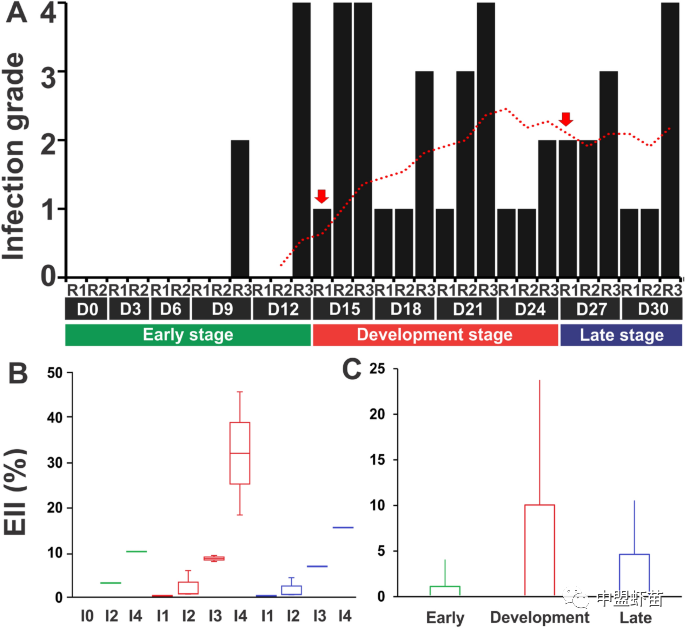 图3:评估EHP感染。(A) EHP感染程度(I0-I4);(B) 按疾病阶段划分的感染(C) 每个疾病阶段的平均值。