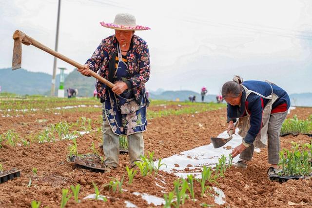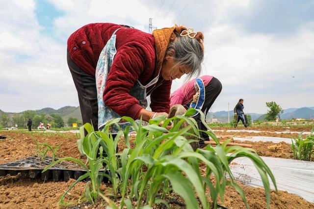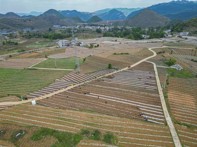 连日来,在织金县茶店乡以补村大豆玉米带状复合种植示范点,群众正抢抓农时在覆上了膜的土地上移栽玉米苗。