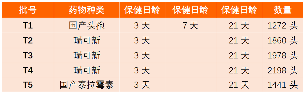 在哺乳期间,分别使用国产头孢、瑞可新和国产泰拉霉素给予仔猪进行保健,观察使用这三种药物保健对整个哺乳期仔猪的死淘、上市情况、整齐度的影响以及在养户期间五周小猪的死淘情况,通过试验结果来分析不同厂家的药物给猪只带来的经济效益。
