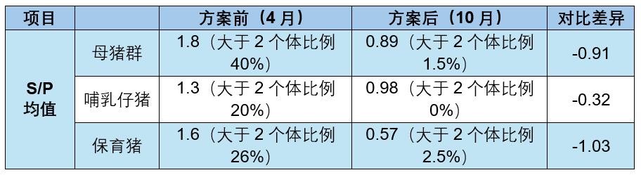 实验室检测结果表明,2024年4月检测数据显示,母猪群蓝耳S/P均值为1.8,S/P值大于2的个体比例为40%;哺乳仔猪蓝耳S/P均值为1.3,S/P值大于2的个体比例为20%;保育猪蓝耳S/P均值为1.6,S/P值大于2的个体比例为26%。而在方案执行后的10月,母猪群蓝耳S/P均值降至0.89,S/P值大于2的个体比例降至1.5%;哺乳仔猪蓝耳S/P均值降至0.98,且无S/P值大于2的个体;保育猪蓝耳S/P均值降至0.57,S/P值大于2的个体比例降至2.5%。检测结果表明,方案执行后,整个猪群的蓝耳S/P值大幅下降,S/P值大于2的个体比例从20-40%降至0-2.5%。