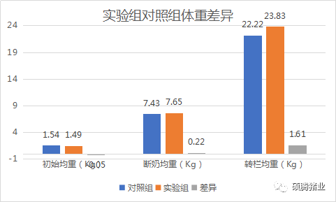 实验组初始体重比对照组少0.05千克,断奶时对照组7.43千克,实验组为 7.65千克,实验组比对照组多220克; 保育转育肥时对照组22.22千克,实验组为23.83千克,实验组比对照组多1.61千克。