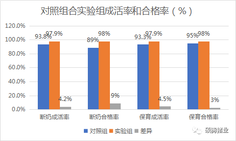 产房实验组为97.9%,对照组为93.8%,实验组高于对照组4.2%;保育阶段实验组为93.3%,对照组为97.9%,实验组高于对照组4.5%;断奶合格仔猪比例产房实验组为89%,对照组为98%,实验组高于对照组9%;保育阶段实验组为95%,对照组为98%,实验组高于对照组3%。