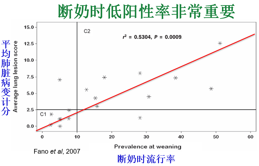研究表明,断奶仔猪的支原体阳性率,直接决定了后期肥猪肺部病变的严重程度(下图)。简单说,断奶时带菌的仔猪越多,育肥阶段的肺炎问题就越严重。那么,断奶仔猪的病原从哪里来?这就引出了第二个关键点。