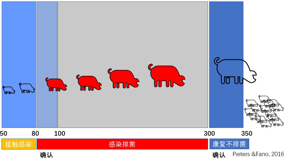 猪只在感染支原体后,带菌时间可长达200天以上,最长达254天(Maria等, 2009)。这正是要从后备母猪下手的核心原因!如果我们能在后备母猪阶段(建议在100日龄前)完成支原体的驯化(让其稳定感染并产生免疫力),那么等到它进入母猪群分娩时,就已经过了排菌期(200多天),从而有效阻止病原向哺乳仔猪的水平传播(如下图示意所示)。