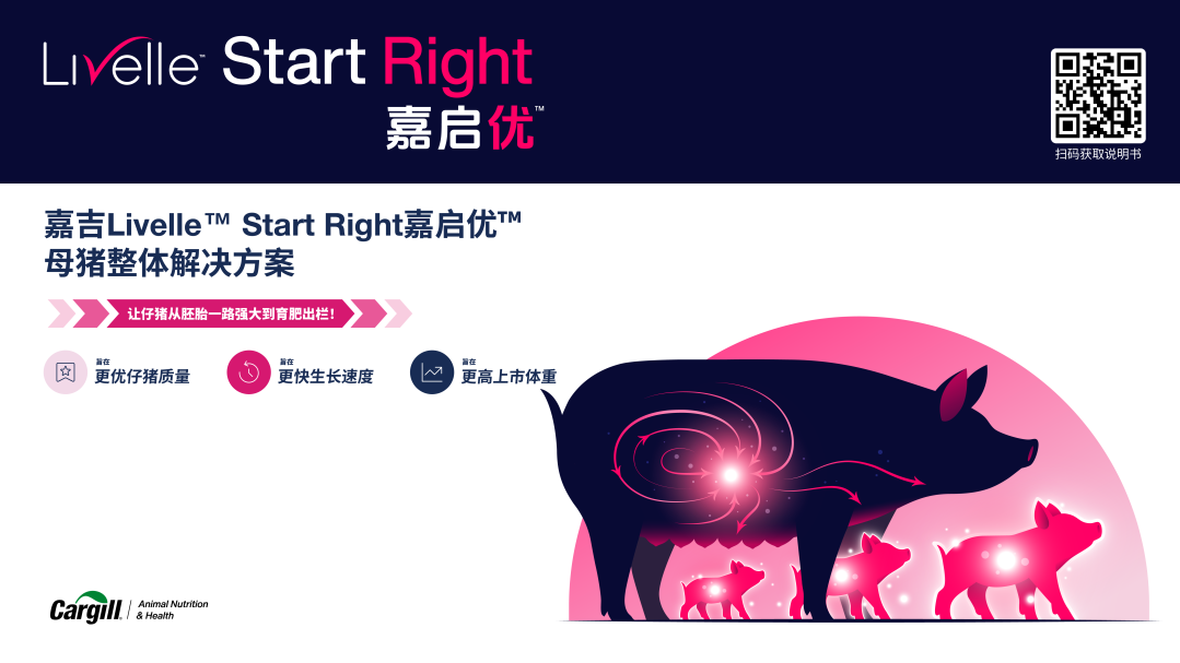良好的开端带来持续优势。据嘉吉实验数据显示,采食Livelle™ Start Right嘉启优™的母猪,其后代保育仔猪的采食量和日增重均有显著提高,且上市体重也有显著提升。