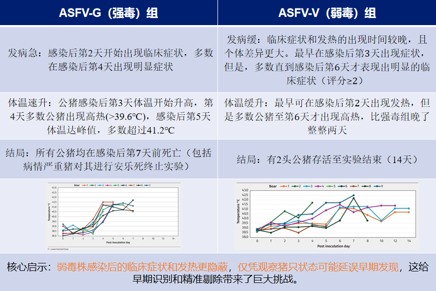 本研究设计了两组实验,全面评估了不同毒力非瘟病毒对公猪的感染与排毒影响,每头猪口鼻联合接种等剂量病毒。