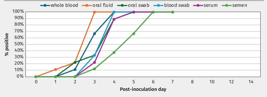 公猪血液检出病毒后,其精液将在1-4天内转为阳性。一旦发现血液阳性,应立即停止使用该公猪的所有精液。
