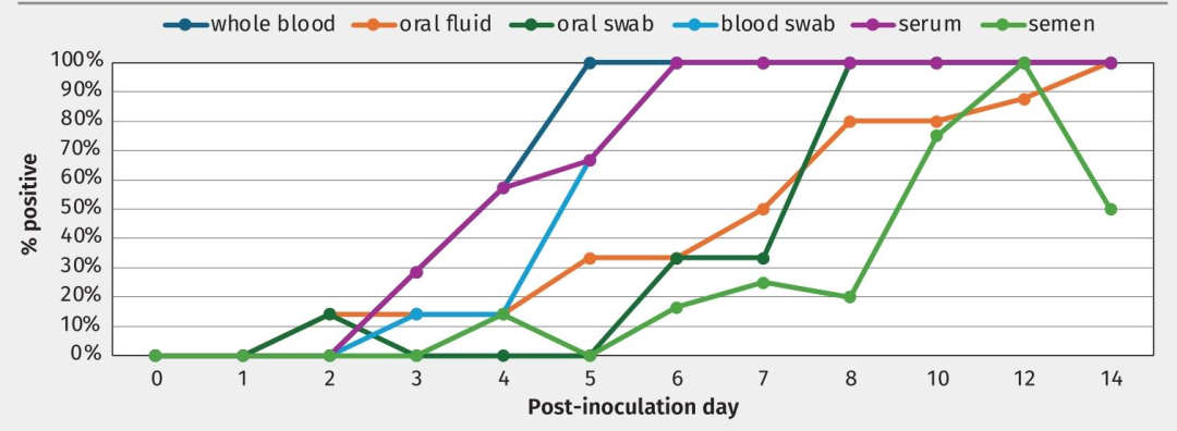 (图为接种非洲猪瘟病毒后不同天数的阳性样本百分比。纵轴代表阳性率,横轴代表接种后天数。不同颜色代表不同样本——深蓝色:全血,橙色:口腔液,绿色:口腔拭子,天蓝色:血液拭子,紫色:血清,绿色:精液。)