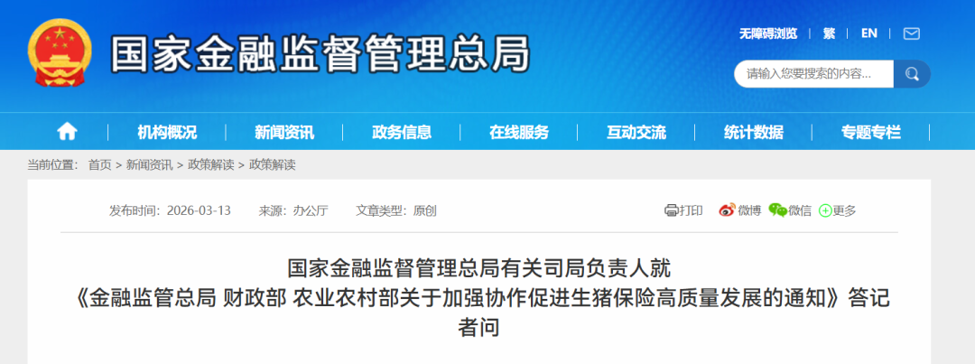 近年来,随着生猪产业经营形式的发展,对生猪保险保障程度、与生猪产业链数据共享等提出了更高要求,有必要出台制度,规范生猪保险关键环节,加大违规惩处力度,推动生猪保险高质量发展。金融监管总局会同财政部、农业农村部等相关单位,充分听取各方意见建议,经多轮研究论证,抓住推进生猪保险高质量发展的关键点,提出了针对性措施,在充分研究的基础上制定了《通知》。这是近年来第一份生猪保险领域部委联合发文,可以形成工作合力,压实各方职责,统筹推动工作落实。