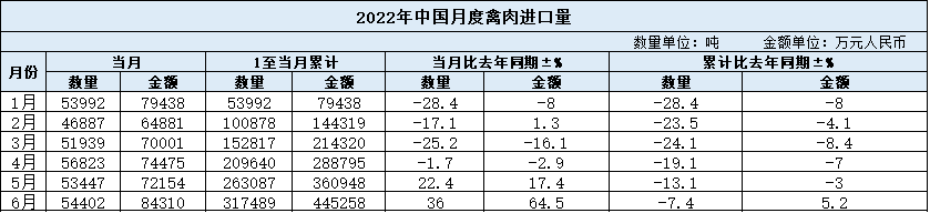 近日,海关总署更新进出口肉类产品统计信息,数据显示,6月份我国肉类(含杂碎)进口60.3万吨,进口额175.9亿元人民币,上半年累计进口345.6万吨,进口额为897.9亿元,同去年上半年相比,进口量下降31.9%,进口额下降16.4%。