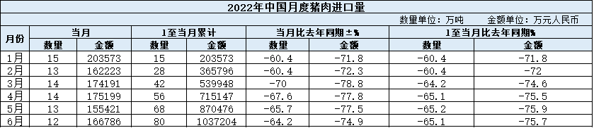6月份,我国猪肉(含杂碎)进口量为22万吨,同比去年减少了51.9%,进口额为322636万元,同比去年减少61.3%;今年上半年累计进口135万吨,同比减少54%,进口额累计1880082万元,同比降低64.1%。从数据中可以看到,进入今年以来,猪肉进口同比去年,呈现持续下跌态势。